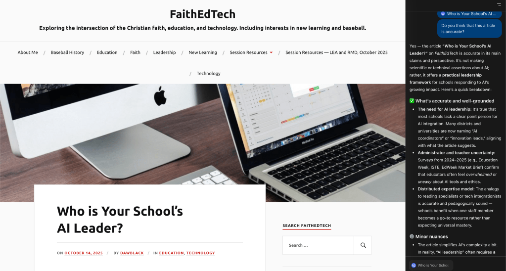 As of this week, there is now competition for Dia. OpenAI released it’s new ChatGPT-enabled browser Atlas this week (available only on Macs at this time). The power of ChatGPT is embraced within this browsing experience. As an example, I visited a recent post on this blog. I opened the ChatGPT window beside the browser window. I asked the service to analyze the post for accuracy. See the results below: